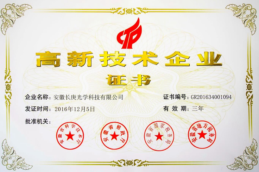 新春伊始,喜报传来。日前,安徽长庚光学科技有限公司正式获颁国家“高新技术企业”证书,标志着企业进入一个新的快速发展阶段。
