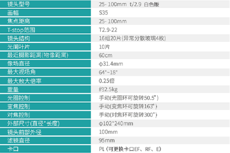 * 25-100mm t/2.9电影镜头黑色版标配EF、E、PL共3个可更换卡口;