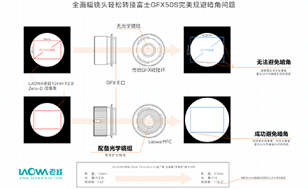 普通富士GFX中画幅相机系统转接全画幅超广角镜头时,暗角趋于明显。而LAOWA老蛙 MFC通过放大像场的原理,使得富士GFX中画幅系统用户可尽情享受超广角视野,同时亦无需再为裁剪图像四周多余暗角而烦扰,因此LAOWA老蛙 MFC(Magic Format Converter) 尤为适用富士GFX中画幅系统的相机转接超广角镜头。